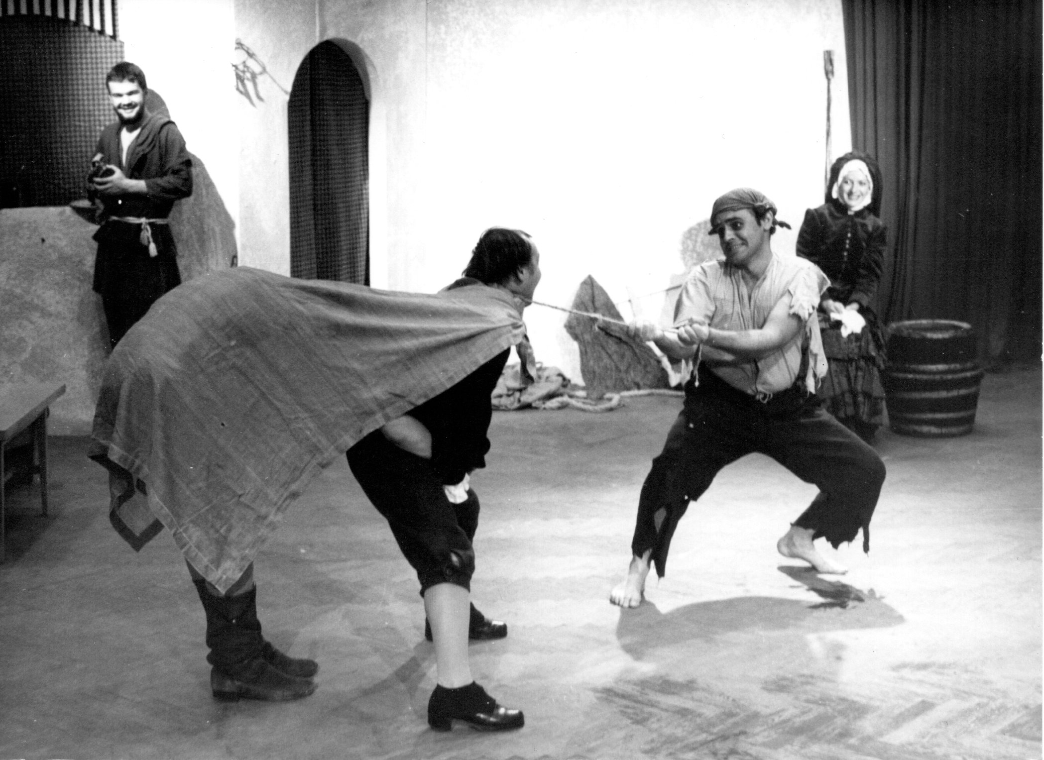 Az itthoni kutatásaim valójában a Wrocławból való, 1980 őszi hazatérésem után elkezdődtek. Akkoriban még a dunaújvárosi PONT Színpad vezetője voltam, így módomban állt, hogy az engem erősen foglalkoztató kérdésre gyakorlati választ is kereshessek. Az érdekelt ugyanis, hogy vajon a szegény színházban megtapasztalt sajátos és nagyon erős nézőhatás elérhető-e akkor is, ha a színjáték a „hagyományos” módon, az improvizációs próba- és előadási metodika nélkül és persze a színészek hihetetlen technikai képességei híján készül el? Hamarosan nyilvánvaló lett, hogy ez akár meg is valósulhat, ha egy előre megírt dráma dramaturgiai rendszerét a szegény színház dramaturgiai világává alakítom át. Azaz magam is egy sajátos szcenáriót hozok létre az eredeti darab nyomán, s azt visszük színre immár „hagyományos” módon, az itthon megszokott színjátéki eszköztárral (próba- és előadási metodikával). Röviden: így született meg 1985 áprilisában a Sancho Pansa királysága című produkció Lengyel Menyhért azonos című vígjátéka nyomán, s előadásaival visszaigazolta az előzetes várakozásokat. (A kísérlet részleteire és folyamatára ezúttal nem térek ki, arról majd egy más formában beszélek bővebben.)